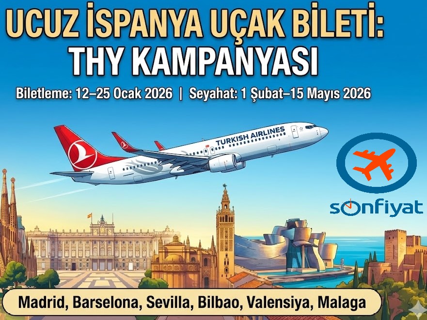 THY’nin İspanya uçuşlarında kampanya dönemi var: biletleme 12–25 Ocak 2026, seyahat 1 Şubat–15 Mayıs 2026. Şehirler: Madrid, Barselona, Sevilla, Bilbao, Valensiya, Malaga.
